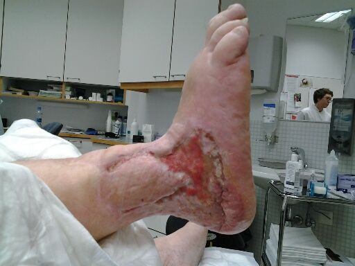 Tässä on lopputulena nilkasta lauantaina 8. kesäkuuta 2013; viiden lihas- ja ihonsiirtoleikkausten jälkeen. Nämä siirteet on otettu selästä ja reisistä. Toki tässä vaihessa ”paketti” ei kivalta näytä.