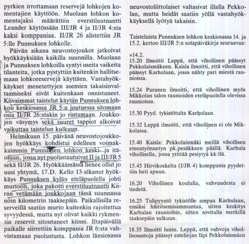 ”KrhK kuljetettiin Itä-Kannakselta yötä myöten yli 40 asteen pakkasessa avokuorma-autoilla Summan suuntaan. Matka ei ollut ylentävä, istuimme kylmässä autossa vieri vieressä, lähestyimme jylisevää rintamaa, ohitimme Kämärän aseman ja majoituimme erääseen läheiseen koulurakennukseen. Juuri kun olimme asettuneet sisään, tuli tieto, että venäläiset olivat aivan ulottuvilla. Koulusta oli pakko lähteä ja vieläpä niin kiireesti, että komeroon minulta jäivät reppu ja aivan uudet saappaat.”