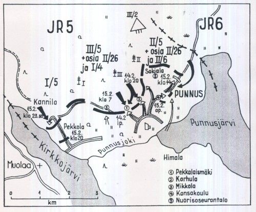 Seuraava suurempi taistelu käytiin Punnusjärven molemmilla puolilla 8. ja 9. helmikuuta välisenä aikana. JR 5:n ja JR 6:n joukkojen onnistui kuitenkin lyödä kaksipäiväisissä taisteluissa neuvostojoukot takaisin lähtöasemiinsa suuria tappioita kärsineenä. [27]