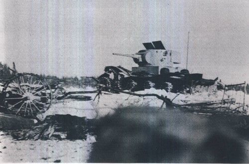 Kuvassa suomalaisasemien eteen tuhottu neuvostoliittolainen T-26-hyökkäysvaunu.