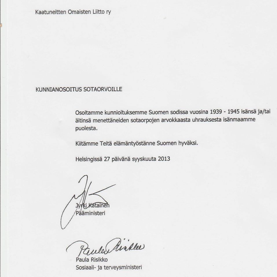 2.12.2014 SAIN POSTIN VÄLITYKSELLÄ sotaorpotunnuksen kunnianosoitus-kirjeen, jonka olivat allekirjoittaneet pääministeri Jyrki Katainen ja sosiaali-ja terveysministeri Paula Risikko.